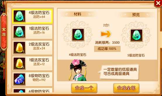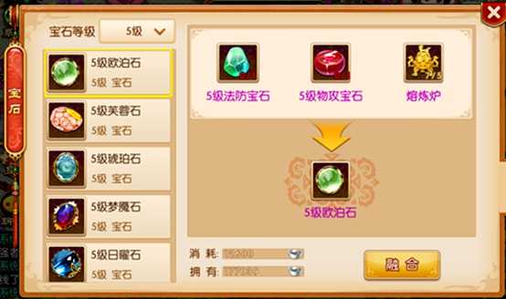 寶石可以熔煉,熔煉寶石可以獲得雙屬性寶石。鑲嵌雙屬性寶石也可以提高戰斗力。寶石熔煉需要消耗相應的屬性寶石、寶石熔爐和白銀。