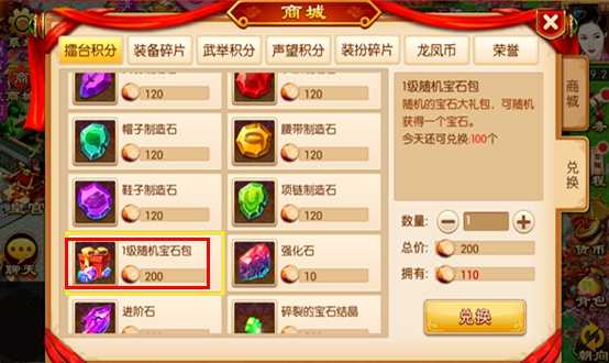 2).兌換挑戰積分、武學積分、聲望積分、龍鳳幣商城可獲得1級隨機寶石包。